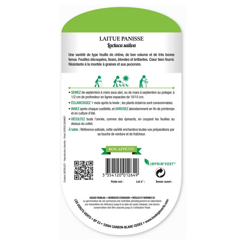 La Laitue Panisse (Feuille De Chêne Pommée) est une variété de type feuille de chêne, de bon volume et de très bonne tenue. Feuilles découpées, lisses, blondes et brillantes. Cœur bien fourni. Résistante à la montée en graines et aux pucerons.